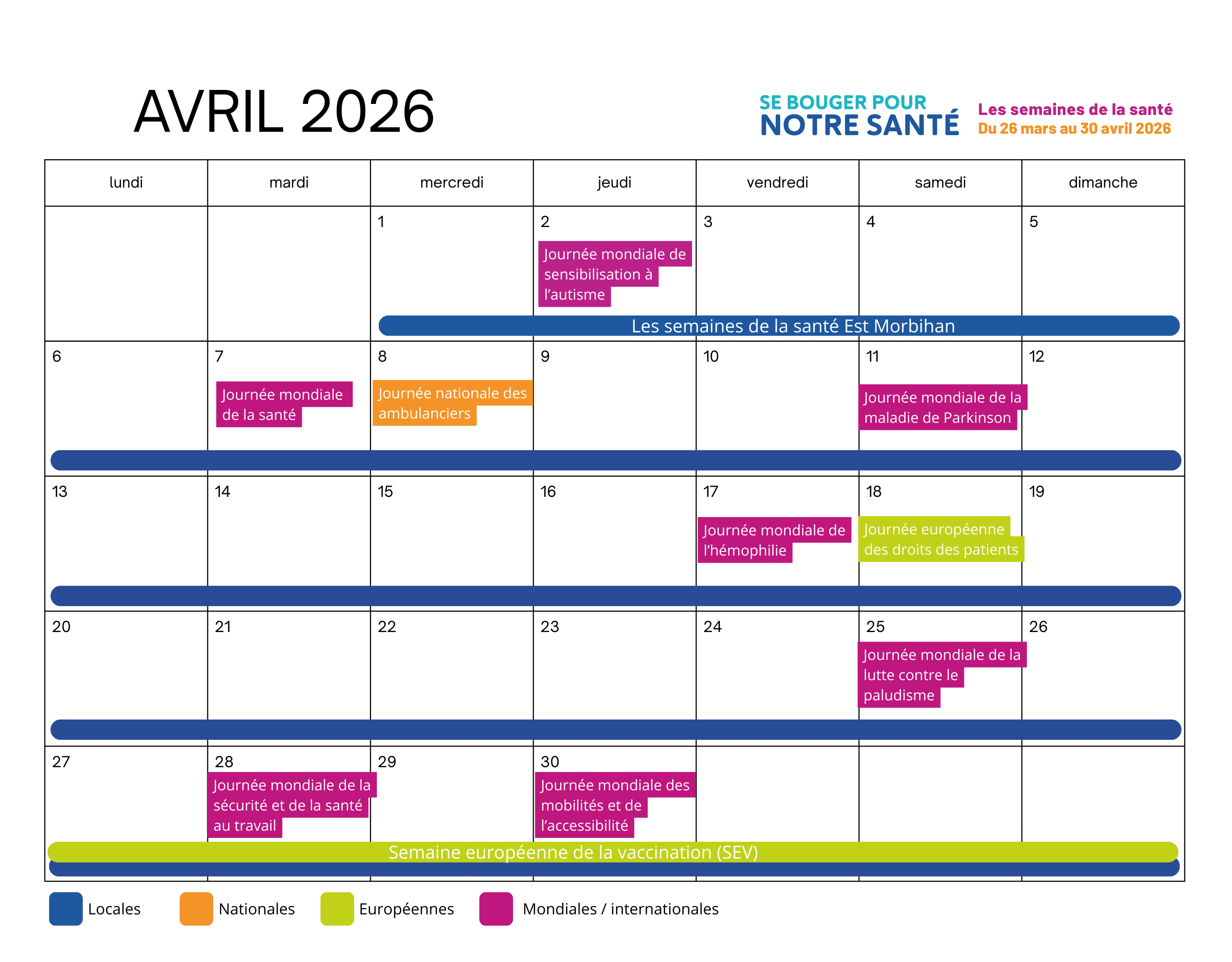 - Fin avril 2026 : Semaine européenne de la vaccination (SEV) (date officielle non communiquée)