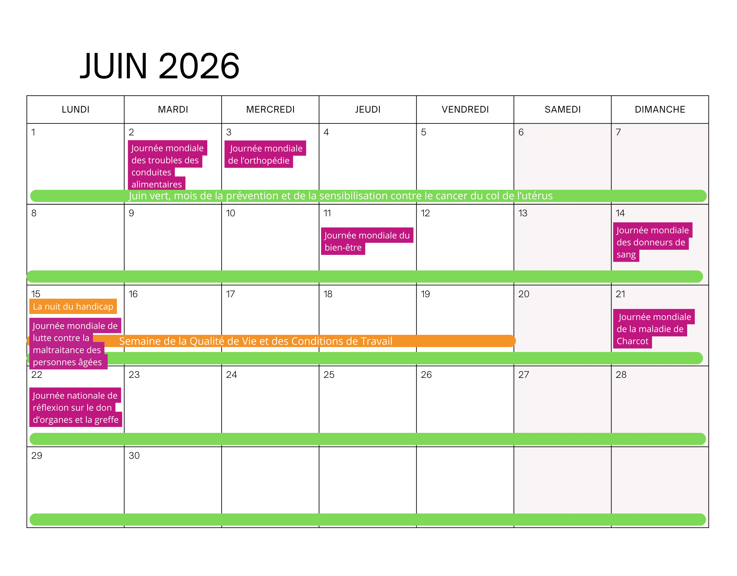 - Tout le mois : juin vert, mois de la prévention et de la sensibilisation contre le cancer du col de l’utérus