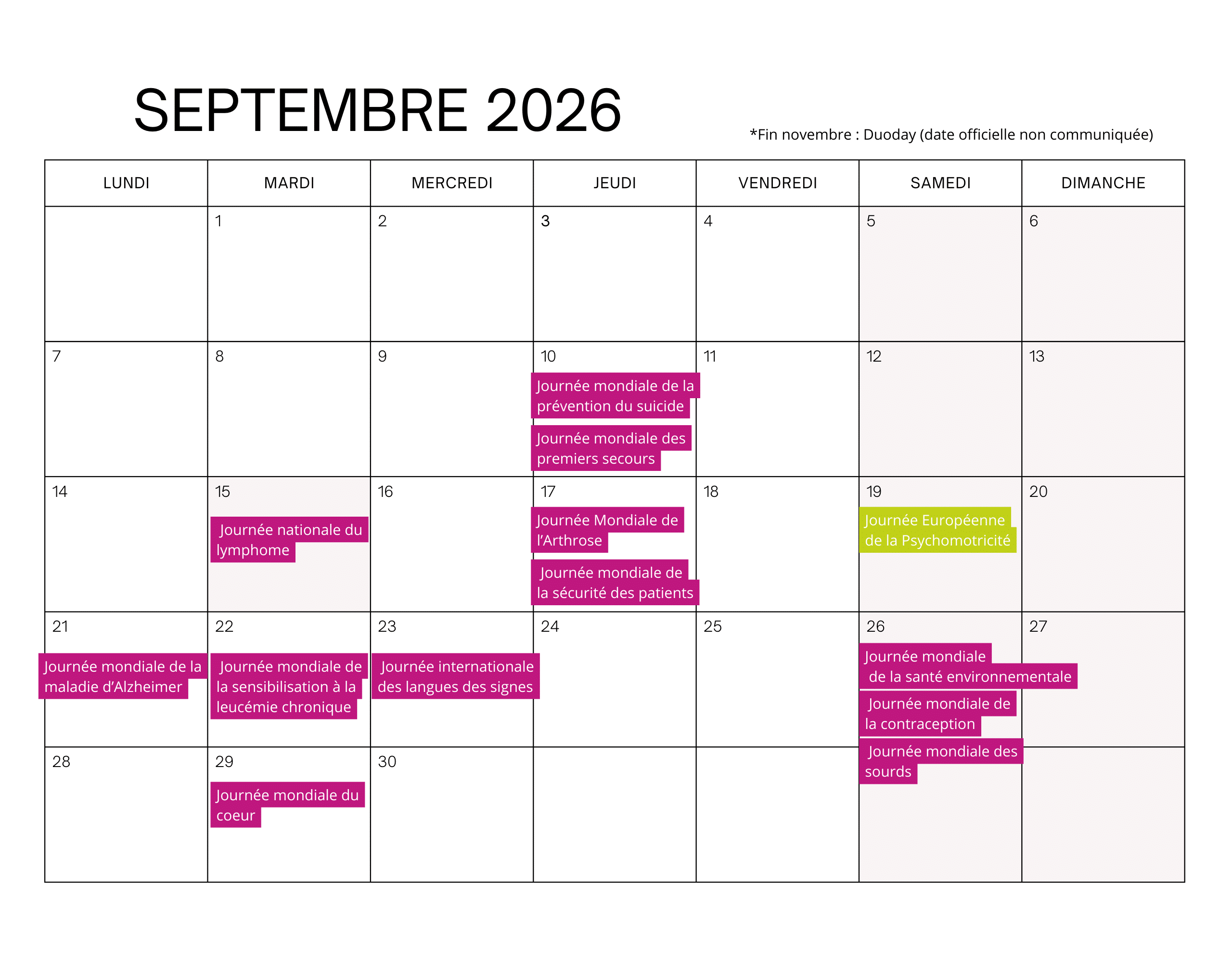 - 10 septembre 2026 : journée mondiale de prévention du suicide